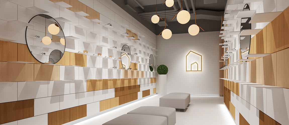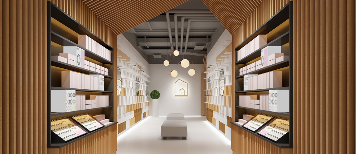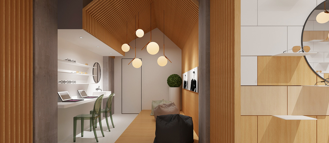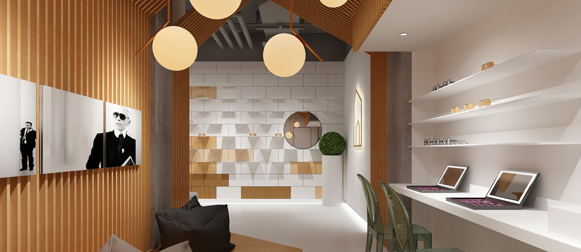 緊促的空間被分為兩個部分,第一部分為美瞳產(chǎn)品及墨鏡展示區(qū)域,第二部分為休閑和佩戴區(qū)域。消費群體較為年輕,整體空間也是呈現(xiàn)出年輕時尚的氛圍,溫暖的原木色搭配純潔的白色,